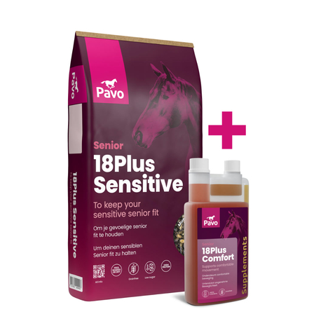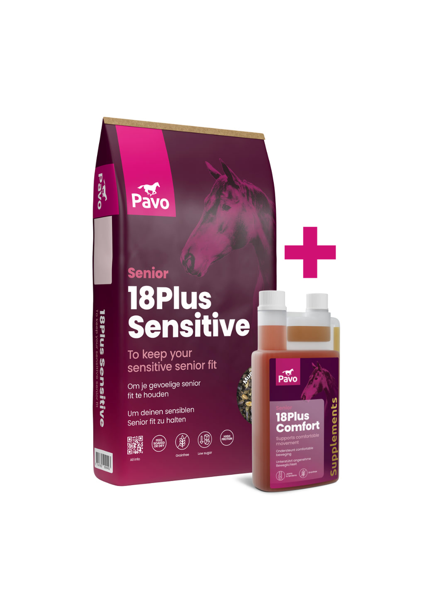 Mit der richtigen Fütterung kannst du dein älteres Pferd bei nachlassender Energie schützen. 18Plus Sensitive ist Speziell fur sensibler Senioren. 18Plus Comfort unterstützt die Gelenke, die ideale Kombination für einen vitalen Senior.