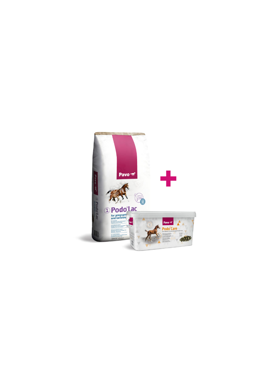 Dieses Bundle unterstützt Stuten ihre Fohlen optimal: Pavo Podo®Lac Pellets versorgt Stuten mit wichtigen Nährstoffen während Trächtigkeit und Laktation, während Pavo Podo®Care dem Fohlen alle essenziellen Vitamine und Mineralstoffe liefert –